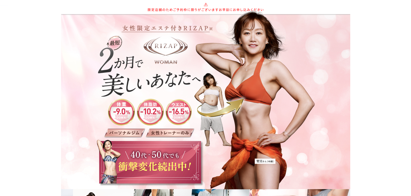 女性専用環境でしっかりサポート+エステも欲しい人にはRIZAP WOMANがおすすめです。