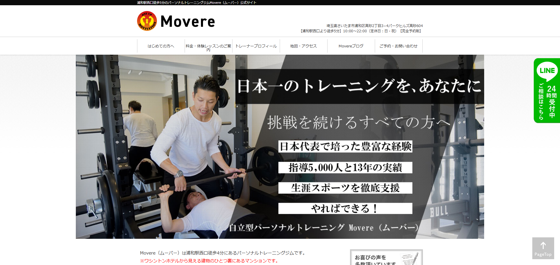 短期集中で体重を落とすのではなく、「一生太らない知識と体質」を手に入れることをゴールに設定しているのがMovereの特徴です。代表トレーナーの佐藤 択磨氏はボクシングオリンピック強化選手・警視庁特殊部隊SAT推薦(45,000人中20名)・大手フィットネスジム売上No.1という異色のキャリアを持ち、累計5,000人以上の指導実績があります。浦和エリアで個人指導実績No.1(〜2023年)を誇り、週1通い2年継続の会員や、医師・経営者・60代以上まで幅広い層が通っているジムです。Google評価4.9(107件)という高い満足度が、そのアプローチの信頼性を示しています。